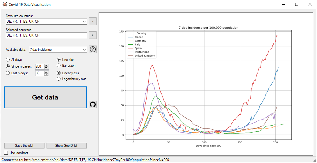 Version 3 of the Covid class and the samples using are now available. The repository has been updated and includes functions to get the 7-day inference for the selected countries. The 7-day inference is the sum of new cases during the last 7 days divided by the population of the country. In Germany a value bigger than 35 will involve additional attention to the area, while a value bigger than 50 will turn the area into a red zone, a high risk area with special rules depending on the reason for the high number.